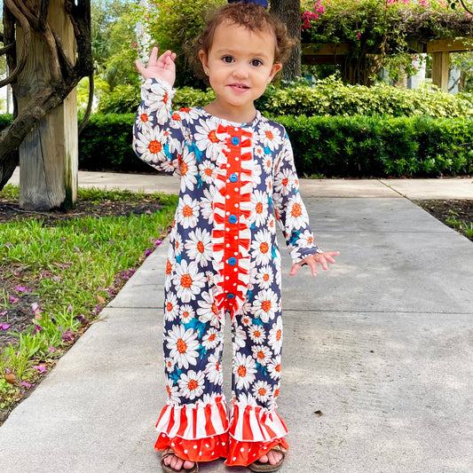 AL Limited Orange Daisy Floral Baby Girls Long Sleeve Tuxedo Lace Romper