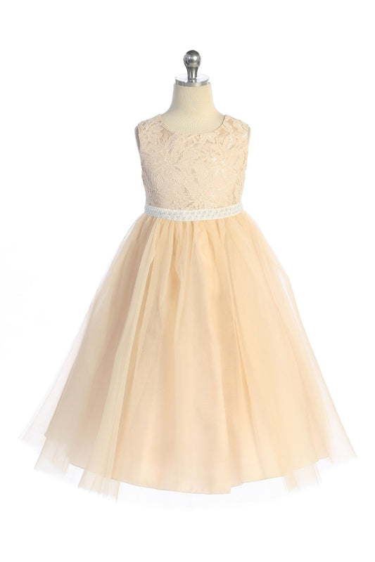 524-C Long Lace Illusion Dress w/ Thick Pearl Trim