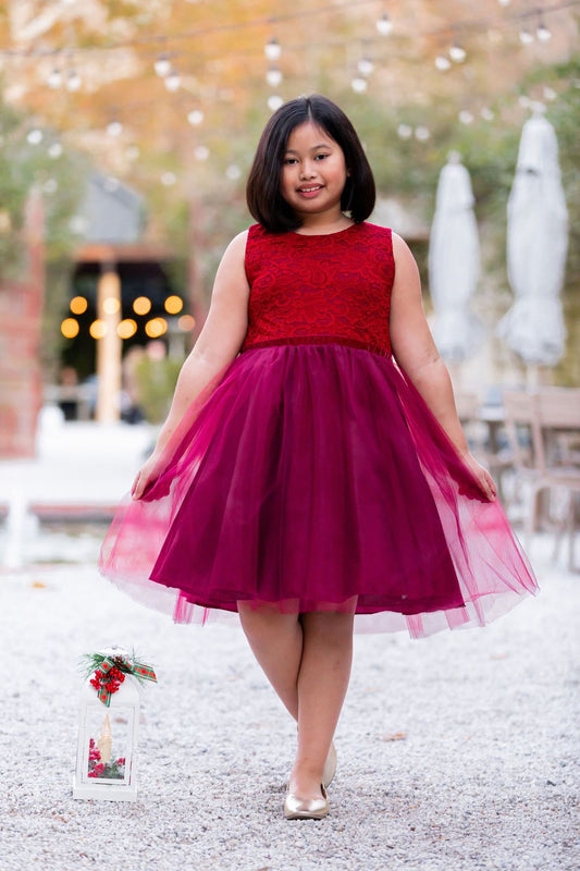 528+- Stretch Lace Tulle Velvet Trim Plus Size Girl Dress