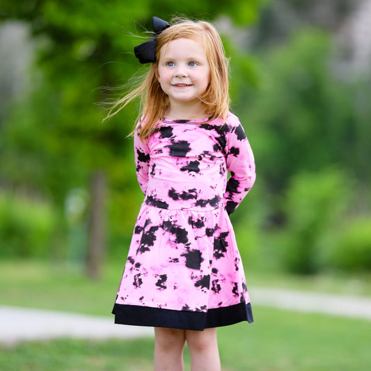 AnnLoren Girls Boutique Pink Black White Tie Dye Long Sleeve Cotton Dress