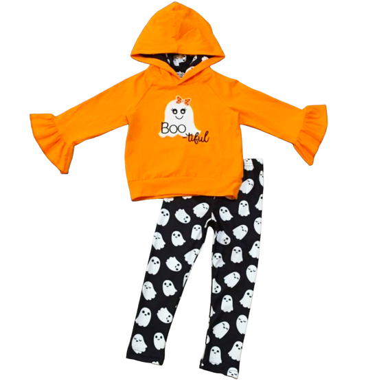 Girls Black & Orange Halloween Ghost Ruffle hoodie and Leggings Outfit