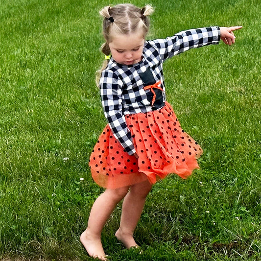 Girls Halloween Dress with Black Cat and Orange & Black Polka Dot Tulle