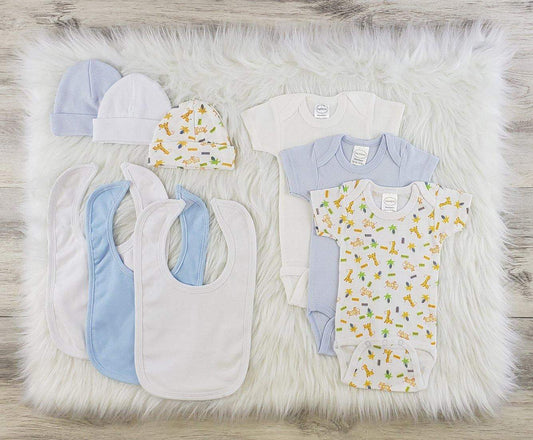 Bambini 9 Pc Boy Layette Baby Bib, Onesies, Beanies Clothes Set (NB,S,M,L)