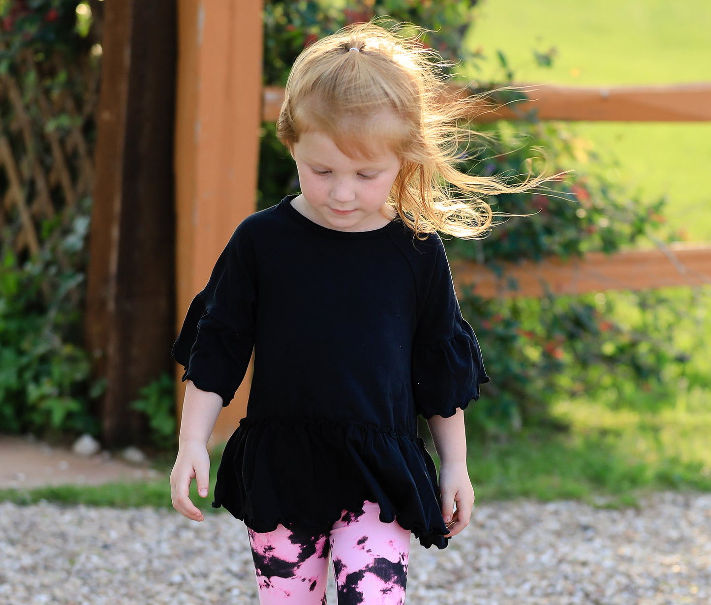 AnnLoren Black printed Soft cotton Shirt with bell sleeves and flowy silhouette, this soft and breezy top is perfect for any weather, especially when paired with her favorite ruffled leggings or shorts. Sleeves are 3/4 length. The 95% high quality Egyptian cotton and 5% stretchy lycra fabric is SUPER soft and comfortable. Premium dye's ensure that your outfit won't fade or run. Machine Washable.