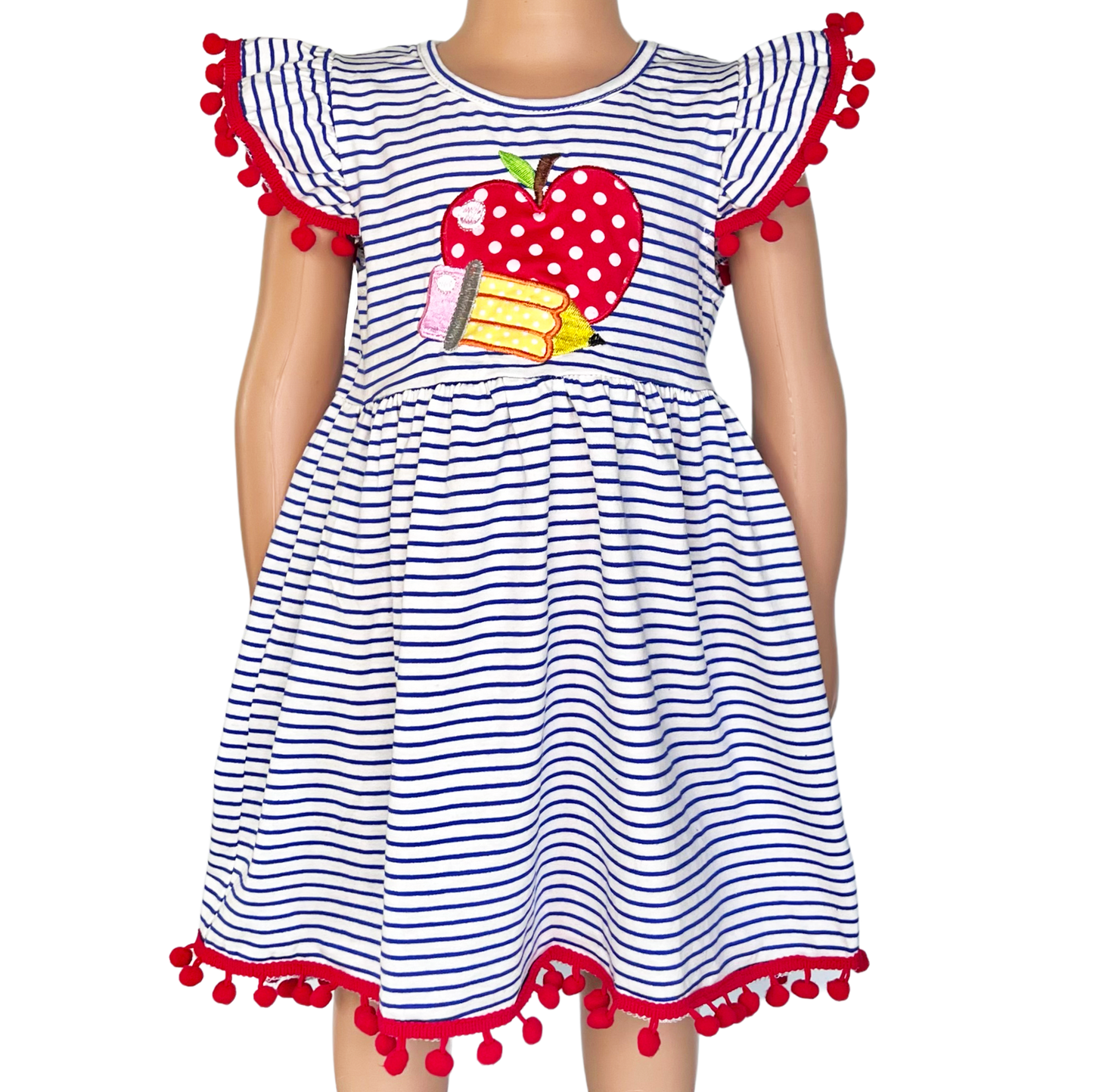 Perfect for Back to School. Blue StrippedĀ cap sleeve Tunic top with ABC and redĀ apple appliques.Ā Ā CoordinatingĀ with elastic waist band for easy fit.Ā
