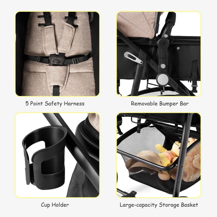 ● Reversible Seat and One-touch Parking: The bassinet direction is reversible, allowing the baby can face outside to satisfy their curiosity about the world, or face parents for more interactions. Also, you can stop the stroller quickly with a one-touch foot-operated brake, improving safety and flexibility when going out along with your little baby.